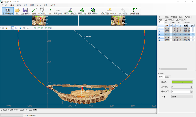 ミサキの内接円をみると,氷見では顕著に真円で表現できる。木積の藤箕のミサキは,真円ではなく正弦波(サインカーブ)に近い曲線を描くのに対し,氷見の藤箕は円である。これが,氷見の箕に力強さ,野趣ともいえる人為の強さを感じさせる一因なのかもしれない。
